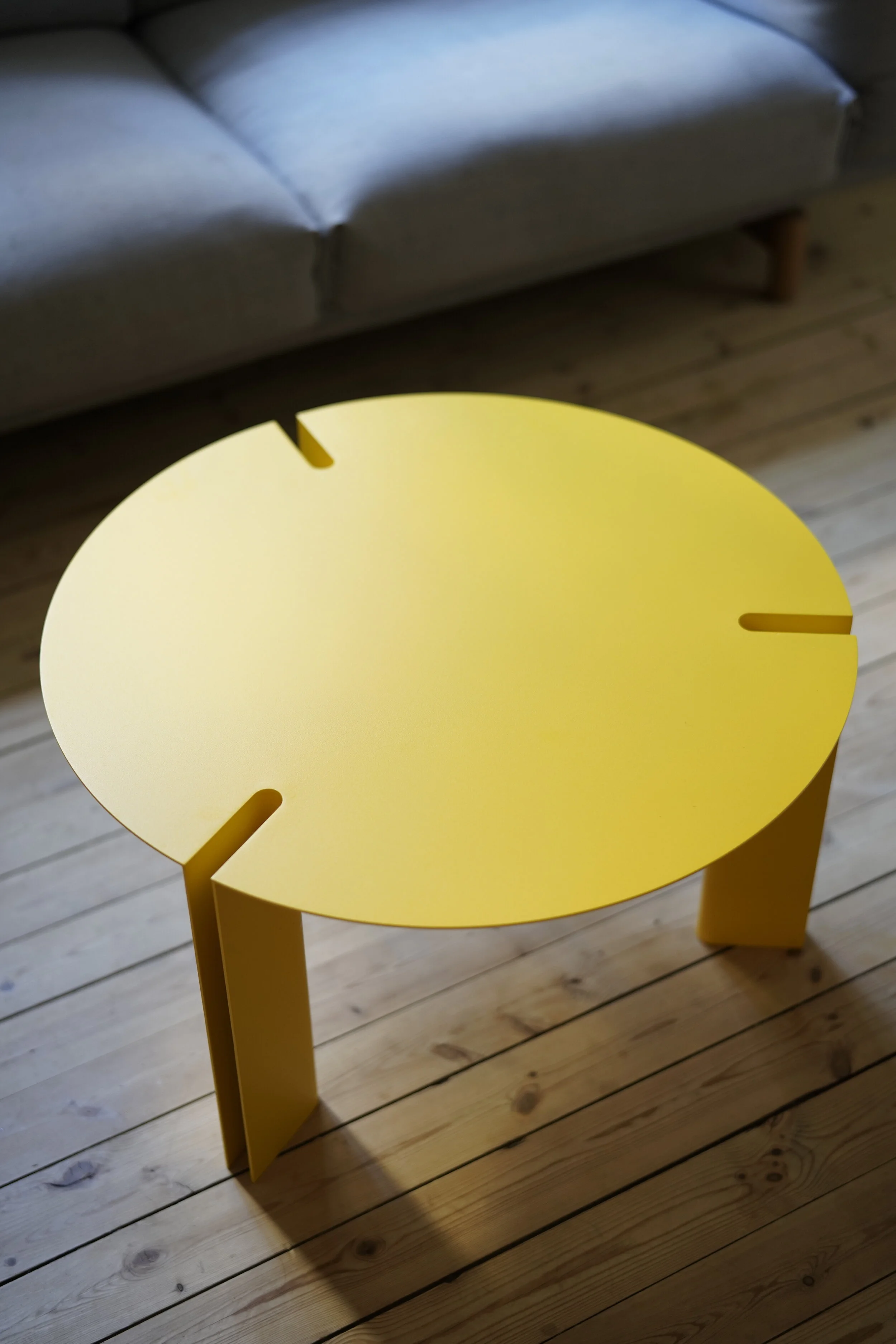 The table is made of metal. Dimensions: Ø 700 mm, H 400 mm.